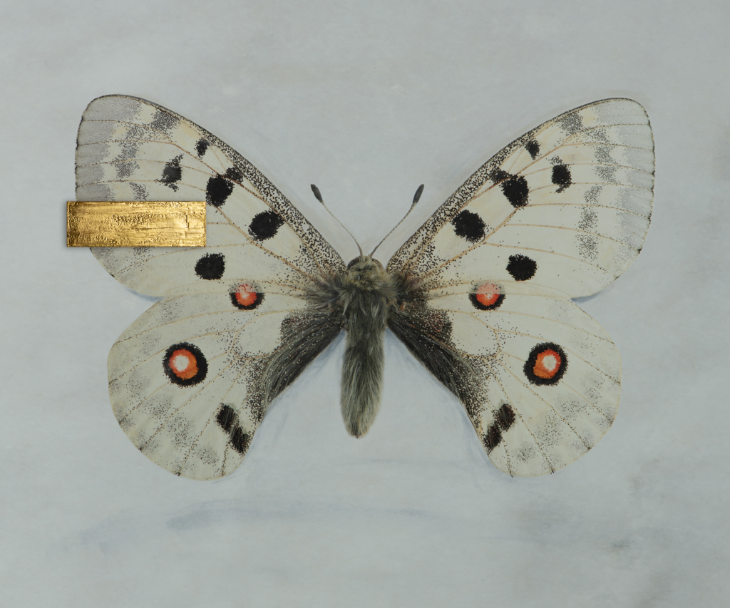 The exhibition features 40–50-year-old butterflies from the Alpine foothills and the Salzkammergut, documented from a systematically curated private Lepidoptera collection. The photographs combine the ephemeral beauty of butterflies with the enduring presence of marble, a material historically associated with permanence, spiritual elevation, and purity across cultures.